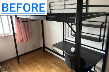 子供部屋として使われていたお部屋から、ロフトベッドと一体型の机の回収を行いました。金属製のフレームは高さがあり、分解作業が必要でしたが、工具を使用して安全に取り外しました。お子様が独立されて空いた部屋を空っぽにしたいとのことで、長年の思い出が詰まった家具を慎重に扱いました。