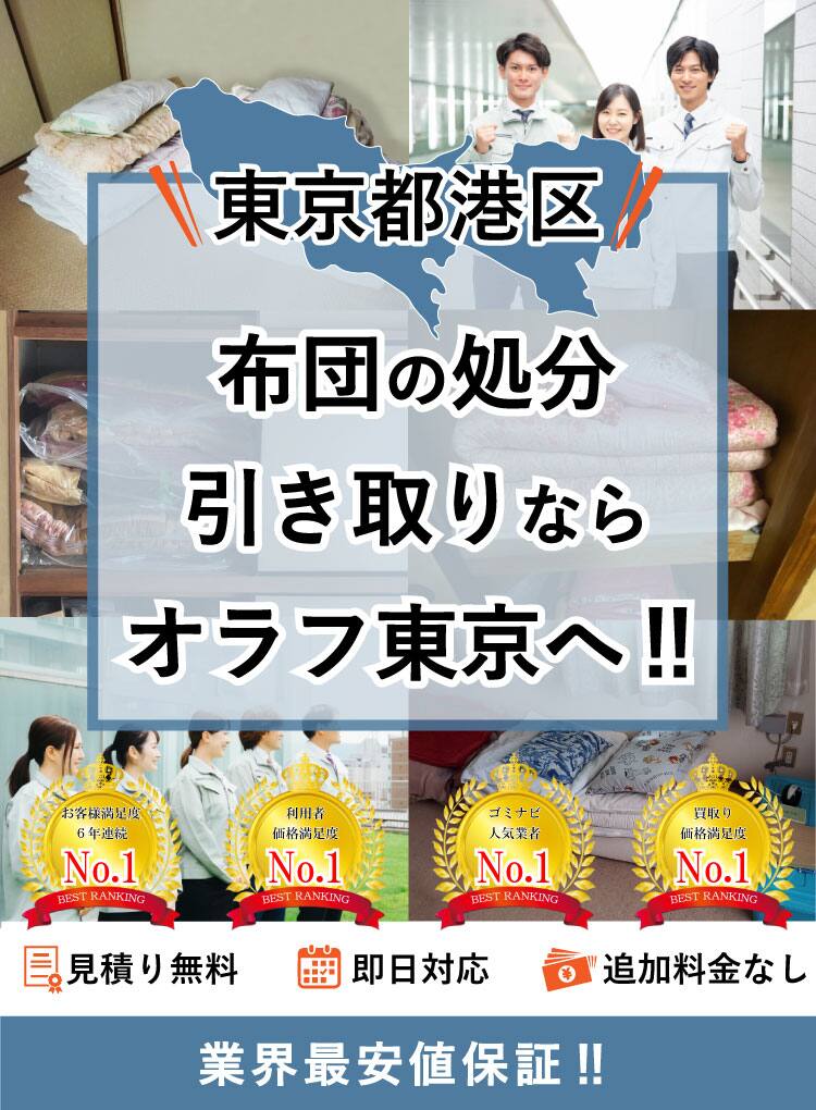 港区で布団の処分にお困りの方は当社までご相談下さい!地域最安値の料金で、迅速、丁寧にお好きな日時で回収します。1枚からでもお伺い出来ますのでお引越しにも最適!勿論押し入れ一杯の大量でも引き取り出来ますので、不用品回収や遺品整理の場合でも何でもご相談下さい。