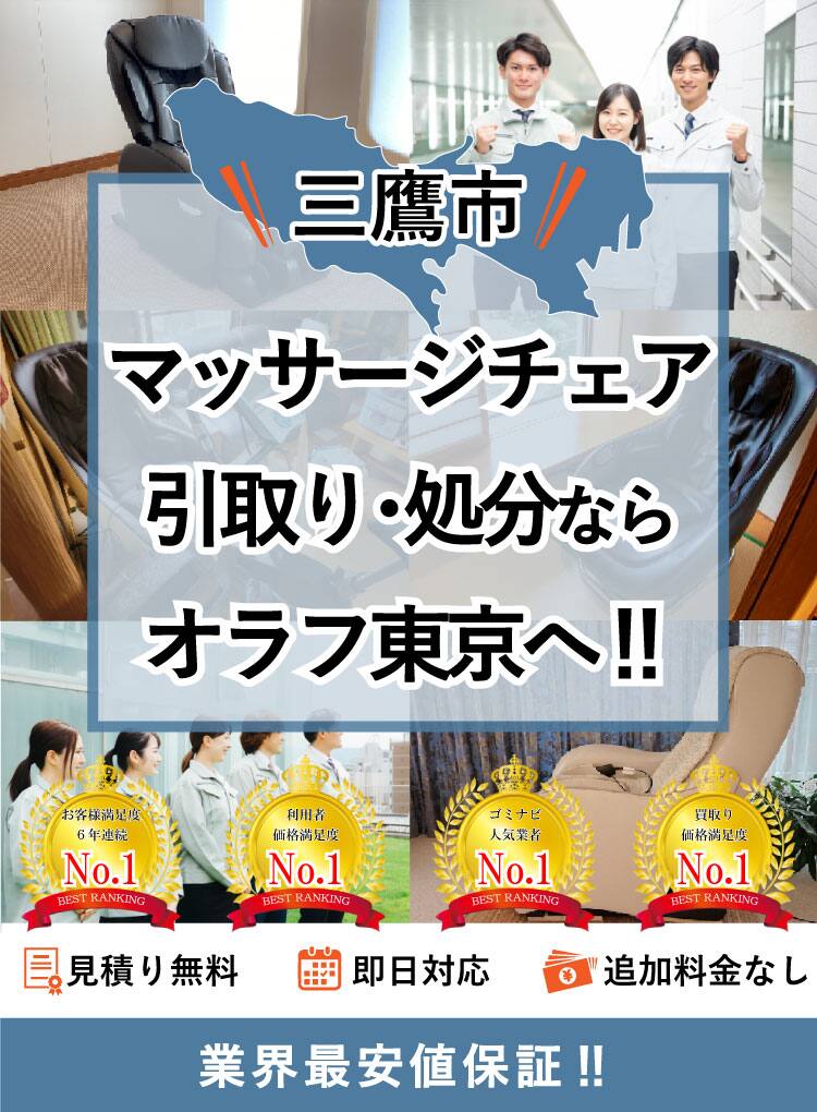 三鷹市でマッサージチェアの処分ならオラフグループにお任せ下さい!地域最安値の料金で使わなくなったマッサージチェアを処分します。マッサージチェアの搬出作業は無料で対応します。重くて部屋から出せないマッサージチェアでも当社専門のプロスタッフに遠慮なくお任せ下さい!お見積もりは24時間365日無料で受付中。