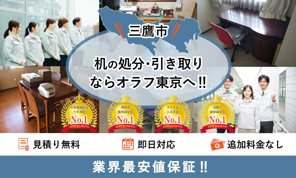 三鷹市で机の処分ならオラフグループにお任せ下さい!地域最安値の料金で不要になった机を処分します。リサイクル出来る机は買取りもOK!机の搬出作業は無料で対応します。大きくて部屋から出せない学習デスクでも当社専門のプロスタッフに遠慮なくお任せ下さい!お見積もりは24時間365日無料で受付中。