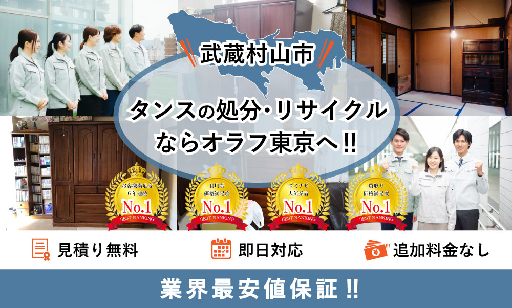武蔵村山市でタンスの処分ならオラフグループにお任せ下さい!地域最安値の料金で不要になったタンスを処分します。リサイクル出来るタンスは買取りもOK!タンスの搬出作業は無料で対応します。大きくて部屋から出せない婚礼タンスでも当社専門のプロスタッフに遠慮なくお任せ下さい!お見積もりは24時間365日無料で受付中。