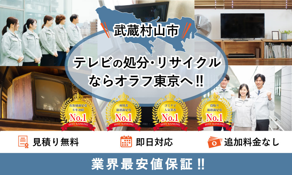 東京都武蔵村山市でテレビの処分ならオラフグループにお任せ下さい!地域最安値の料金で不要になったテレビを処分します。リサイクル出来るテレビは買取りもOK!お部屋からの搬出作業は無料で対応します。お見積もりは24時間365日無料で受付中。