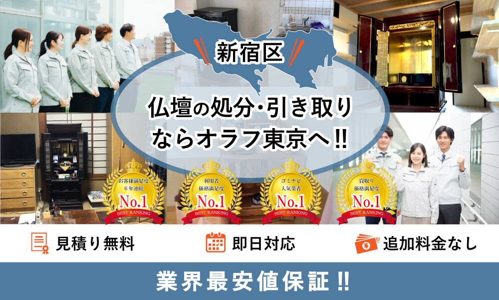 新宿区でお仏壇の処分ならオラフグループにお任せ下さい!地域最安値の料金で不要になったお仏壇を供養・処分致します。供養の有無や種類はご予算に合わせてお選びいただけます。お部屋からお仏壇の搬出作業は当社のスタッフが無料で対応します。お見積もりは24時間365日無料で受付中。