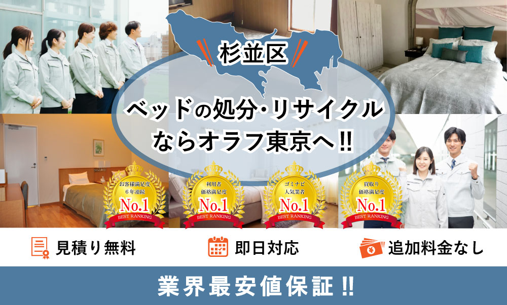 杉並区でベッド・マットレスの処分ならオラフグループにお任せ下さい!地域最安値の料金で不要になったベッド・マットレスを処分します。リサイクル出来るベッドは買取りもOK!お部屋からの搬出作業は無料で対応します。お見積もりは24時間365日無料で受付中。