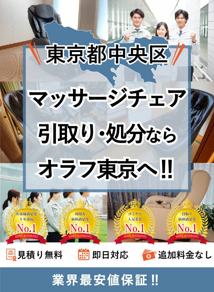 中央区でマッサージチェアの処分ならオラフグループにお任せ下さい!地域最安値の料金で使わなくなったマッサージチェアを処分します。マッサージチェアの搬出作業は無料で対応します。重くて部屋から出せないマッサージチェアでも当社専門のプロスタッフに遠慮なくお任せ下さい!お見積もりは24時間365日無料で受付中。