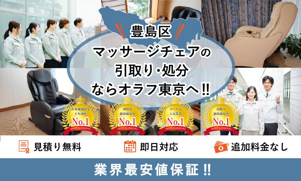 豊島区でマッサージチェアの処分ならオラフグループにお任せ下さい!地域最安値の料金で使わなくなったマッサージチェアを処分します。マッサージチェアの搬出作業は無料で対応します。重くて部屋から出せないマッサージチェアでも当社専門のプロスタッフに遠慮なくお任せ下さい!お見積もりは24時間365日無料で受付中。