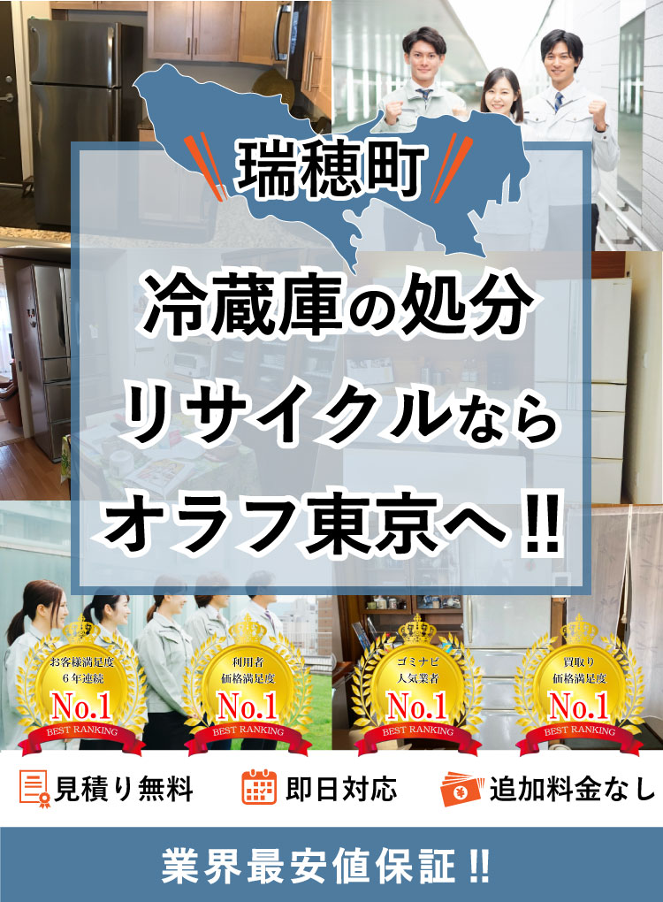 瑞穂町で冷蔵庫の処分ならオラフグループにお任せ下さい!地域最安値の料金で不要になった冷蔵庫を処分します。リサイクル出来る冷蔵庫は買取りもOK!お部屋からの搬出作業は無料で対応します。お見積もりは24時間365日無料で受付中。