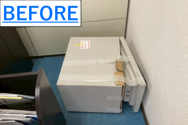 今回回収したのは、オフィスの隅に置かれていた金庫でした。写真でも分かる通り、狭いスペースに置かれており、重量も相当ありました。お客様からは「オフィスの業務に支障が出ないよう、短時間でお願いしたい」とのご要望がありましたので、訪問時間を事前に調整し、作業当日は予定通りスムーズに対応できました。
