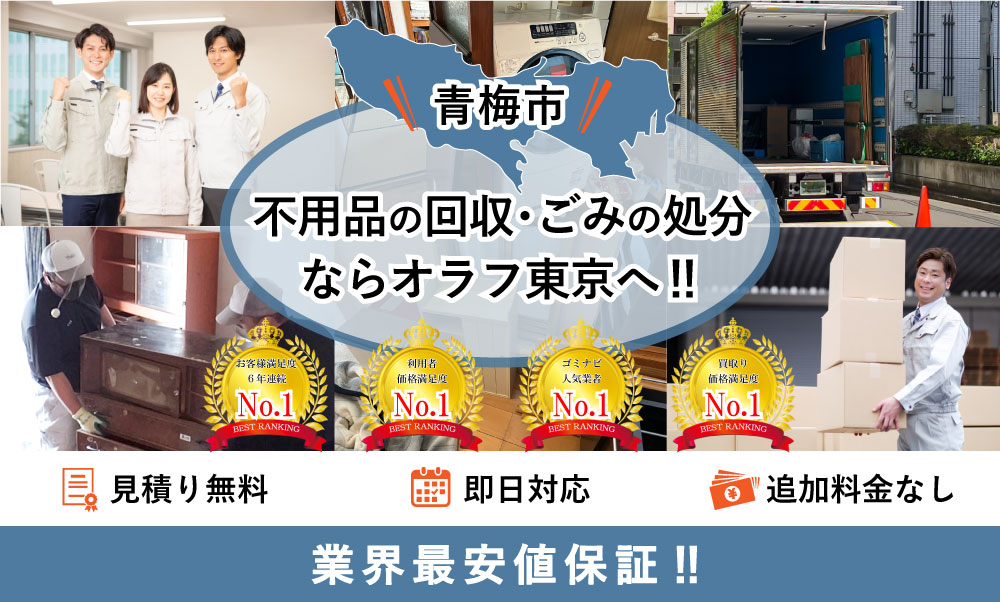 青梅市で不用品回収サービスなら「早い・安い・丁寧」なオラフグループ!家具、家電、廃品、ごみ、何でも回収します。青梅市No1を目指す圧巻のサービス内容と最安値の料金で要らない不用品を即日回収します。不用品の高価買取りも実施!お見積りは24時間365日無料で受付中。